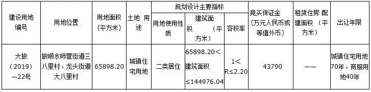 据大连市国有建设用地官网显示,编号为大旅(2019)—22号的位于旅顺水师营街道三八里村、龙头街道大八里村的一宗地块将于2020年1月10日出让,这将是2020年出让的第一宗地块。该地块用地面积65898.20平方米,容积率为1<R≤2.20,竞买保证金为1<R≤2.20,产权为城镇住宅用地70年、商服用地40年。