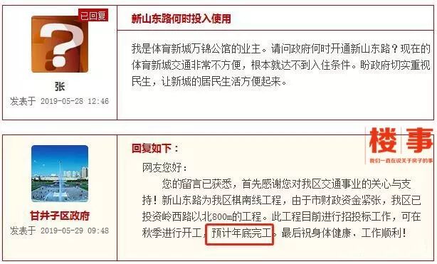 2019年5月份,甘井子区政府在民意网对网友的回答中表示,新山东路将“预计年底完工”,这条连接体育新城和华南广场的重要交通路段,将成为该项目乃至体育新城板块的重要配套工程。